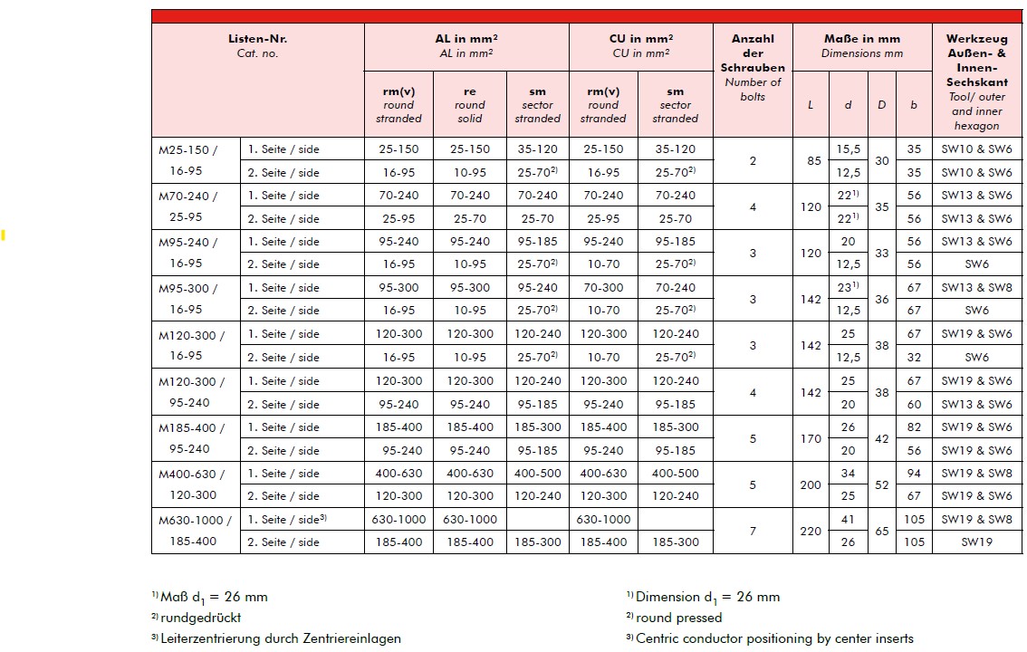 Die im Katalog beschriebenen Produkte sind für den Anschluss von Energieleiterkabeln (Klasse 1 & 2) der Leiterbauformen rund-eindrähtig (RE) und rund-mehrdrähtig (RM), sektor-eindrähtig (SE) und sektor-mehrdrähtig (SM) sowie rund-mehrdrähtig-verdichtet (RMV) ausschließlich auf blanken Leitern und für Leitertemperaturen bis 90°C vorgesehen. Leiterfüllmaterialien wie Quellbänder, Puder oder Ähnliches sind vor der Montage vollständig zu entfernen.