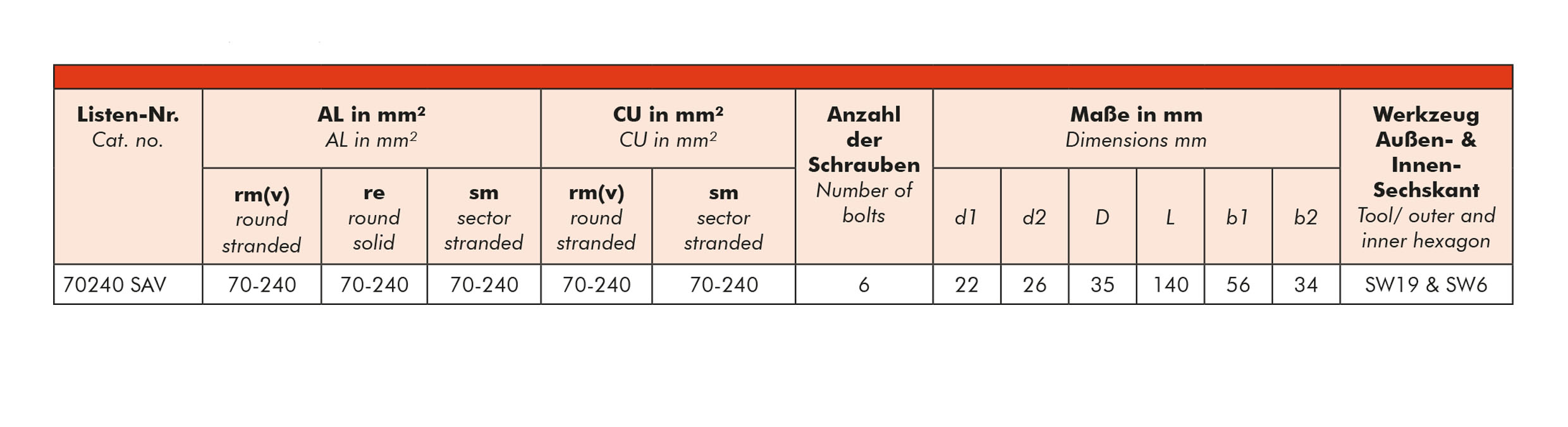 Die im Katalog beschriebenen Produkte sind für den Anschluss von Energieleiterkabeln (Klasse 1 & 2) der Leiterbauformen rund-eindrähtig (RE) und rund-mehrdrähtig (RM), sektor-eindrähtig (SE) und sektor-mehrdrähtig (SM) sowie rund-mehrdrähtig-verdichtet (RMV) ausschließlich auf blanken Leitern und für Leitertemperaturen bis 90°C vorgesehen. Leiterfüllmaterialien wie Quellbänder, Puder oder Ähnliches sind vor der Montage vollständig zu entfernen.