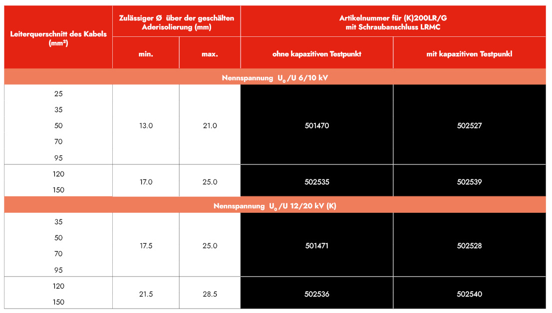 Die Zuordnung gilt nur für VPE-isolierte Kabel (Abmessungen nach DIN VDE 0276-620) mit abschälbaren Leitschichten und mehrdrähtigen Leitern. Bei anderen Kabelaufbauten bitten wir um Werksrückfrage.