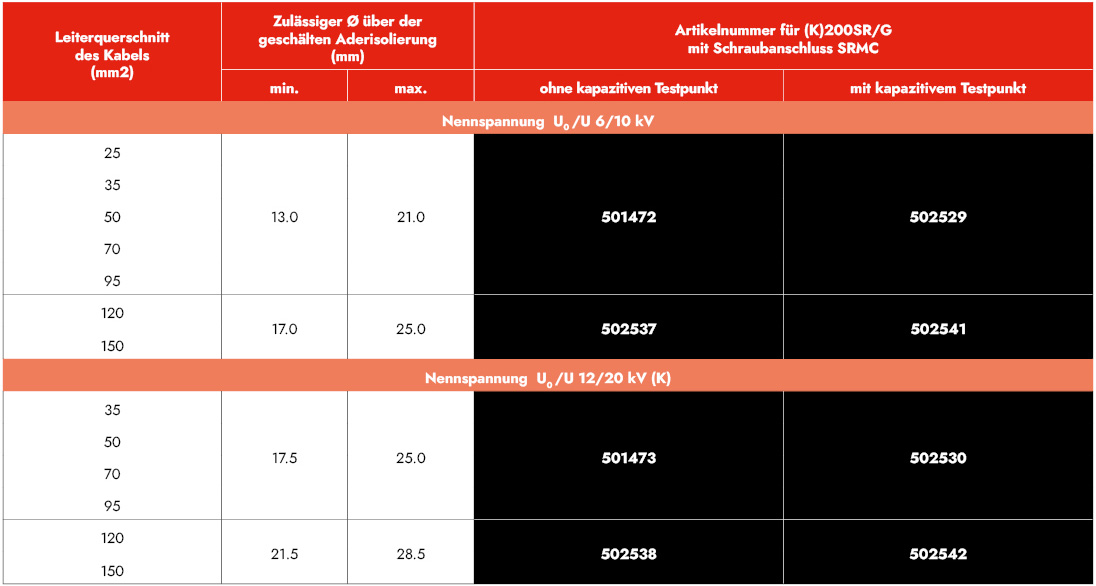 Die Zuordnung gilt nur für VPE-isolierte Kabel (Abmessungen nach DIN VDE 0276-620) mit abschälbaren Leitschichten und mehrdrähtigen Leitern. Bei anderen Kabelaufbauten bitten wir um Werksrückfrage.