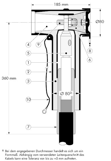 2) Bei dem angegebenen Durchmesser handelt es sich um ein Formmaß. Abhängig vom verwendeten Leiterquerschnitt des Kabels kann eine Toleranz von bis zu +5 mm auftreten.