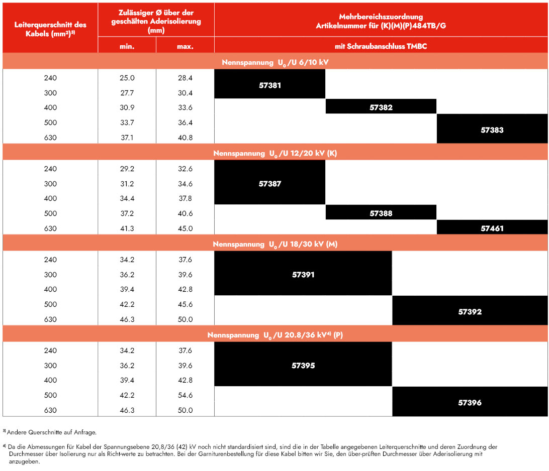 3) Da die Abmessungen für Kabel der Spannungsebene 20,8/36 (42) kV noch nicht standardisiert sind, sind die in der Tabelle angegebenen Leiterquerschnitte und deren Zuordnung der Durchmesser über Isolierung nur als Richtwerte zu betrachten. Bei der Garnituren-Bestellung für diese Kabel bitten wir Sie, den überprüften Durchmesser über Aderisolierung mit anzugeben.