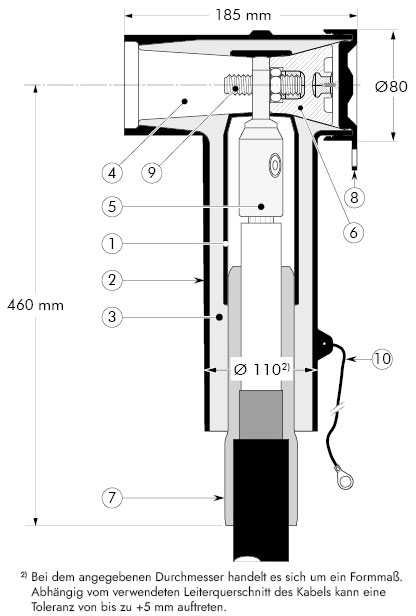2) Bei dem angegebenen Durchmesser handelt es sich um ein Formmaß. Abhängig vom verwendeten Leiterquerschnitt des Kabels kann eine Toleranz von bis zu +5 mm auftreten.