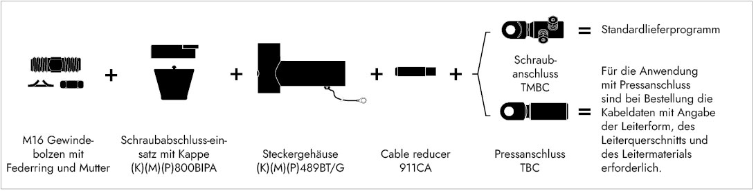 Für die Anwendung mit Pressanschluss sind bei Bestellung die Kabeldaten mit Angabe der Leiterform, des Leiterquerschnitts und des Leitermaterials erforderlich.