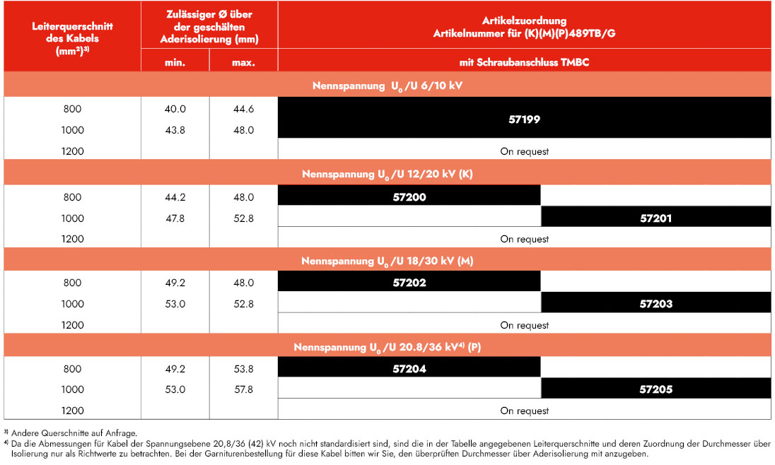 4) Da die Abmessungen für Kabel der Spannungsebene 20,8/36 (42) kV noch nicht standardisiert sind, sind die in der Tabelle angegebenen Leiterquerschnitte und deren Zuordnung der Durchmesser über Isolierung nur als Richtwerte zu betrachten.