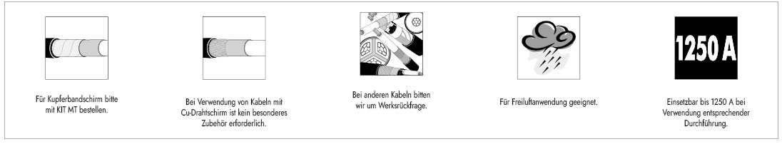 Die im Katalog beschriebenen Produkte sind für den Anschluss von Energieleiterkabeln (Klasse 1 & 2) der Leiterbauformen rund-eindrähtig (RE) und rund-mehrdrähtig (RM), sektor-eindrähtig (SE) und sektor-mehrdrähtig (SM) sowie rund-mehrdrähtig-verdichtet (RMV) ausschließlich auf blanken Leitern vorgesehen. Leiterfüllmaterialien wie Quellbänder, Puder oder Ähnliches sind vor der Montage vollständig zu entfernen. Die Prüfung der Verwendbarkeit auf Grundlage der tatsächlich vorliegenden Leiterabmessung, obliegt im Einzelfall dem Anwender. Dies gilt auch für die Verwendung der Produkte beim Einsatz flexibler Leiter (Klasse 5 & 6).