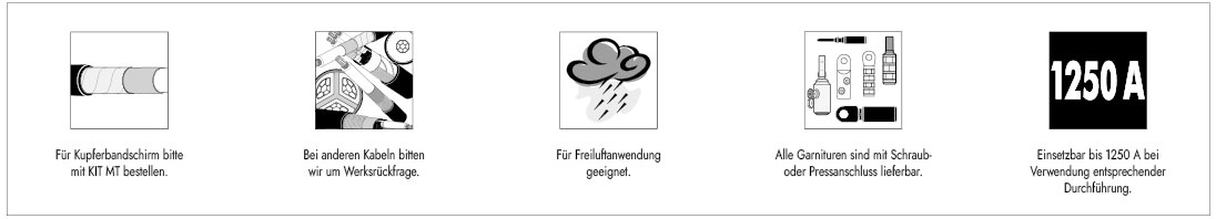 Die im Katalog beschriebenen Produkte sind für den Anschluss von Energieleiterkabeln (Klasse 1 & 2) der Leiterbauformen rund-eindrähtig (RE) und rund-mehrdrähtig (RM), sektor-eindrähtig (SE) und sektor-mehrdrähtig (SM) sowie rund-mehrdrähtig-verdichtet (RMV) ausschließlich auf blanken Leitern vorgesehen. Leiterfüllmaterialien wie Quellbänder, Puder oder Ähnliches sind vor der Montage vollständig zu entfernen. Die Prüfung der Verwendbarkeit auf Grundlage der tatsächlich vorliegenden Leiterabmessung, obliegt im Einzelfall dem Anwender. Dies gilt auch für die Verwendung der Produkte beim Einsatz flexibler Leiter (Klasse 5 & 6).