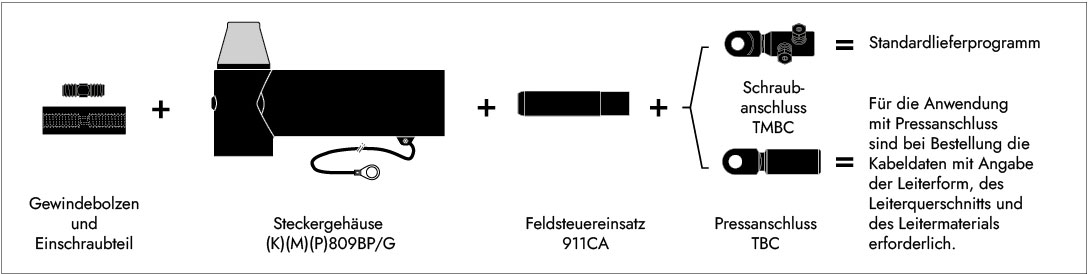 Für die Anwendung mit Pressanschluss sind bei Bestellung die Kabeldaten mit Angabe der Leiterform, des Leiterquerschnitts und des Leitermaterials erforderlich.