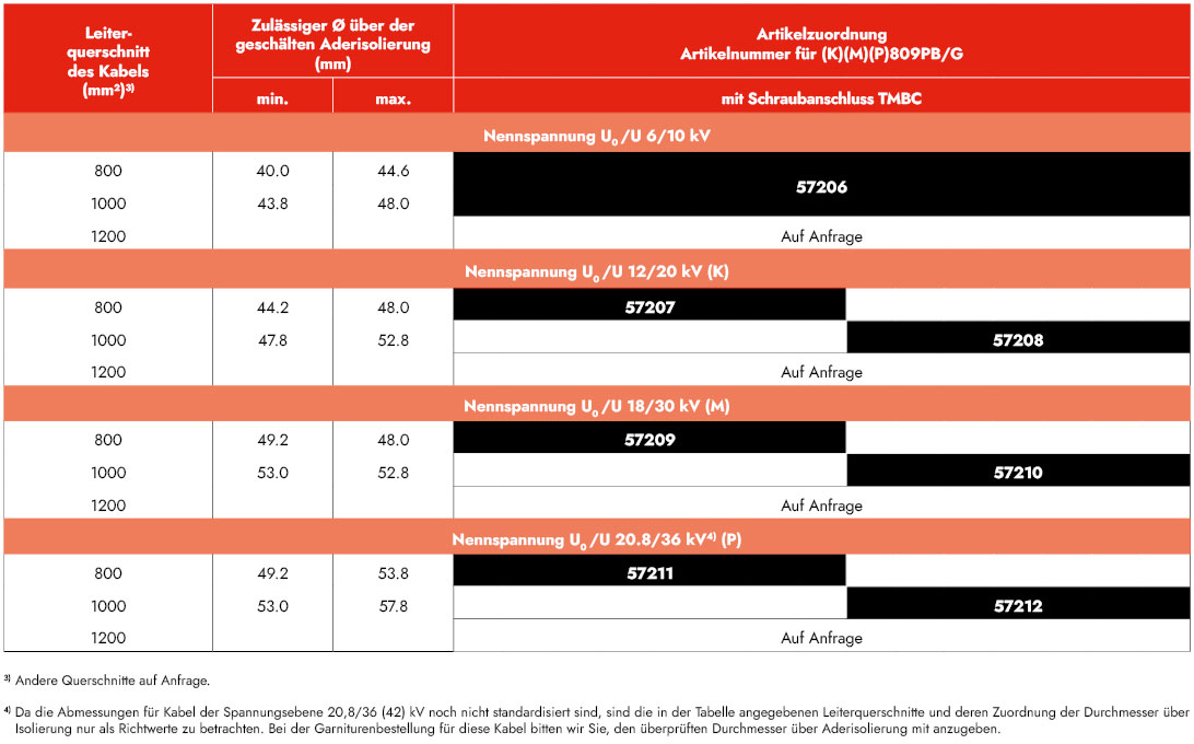 4) Da die Abmessungen für Kabel der Spannungsebene 20,8/36 (42) kV noch nicht standardisiert sind, sind die in der Tabelle angegebenen Leiterquerschnitte und deren Zuordnung der Durchmesser über Isolierung nur als Richtwerte zu betrachten. Bei der Garnituren-Bestellung für diese Kabel bitten wir Sie, den überprüften Durchmesser über Aderisolierung mit anzugeben.