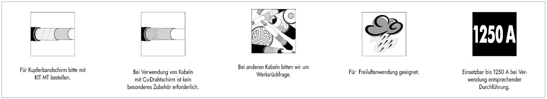 Die im Katalog beschriebenen Produkte sind für den Anschluss von Energieleiterkabeln (Klasse 1 & 2) der Leiterbauformen rund-eindrähtig (RE) und rund-mehrdrähtig (RM), sektor-eindrähtig (SE) und sektor-mehrdrähtig (SM) sowie rund-mehrdrähtig-verdichtet (RMV) ausschließlich auf blanken Leitern vorgesehen. Leiterfüllmaterialien wie Quellbänder, Puder oder Ähnliches sind vor der Montage vollständig zu entfernen. Die Prüfung der Verwendbarkeit auf Grundlage der tatsächlich vorliegenden Leiterabmessung, obliegt im Einzelfall dem Anwender. Dies gilt auch für die Verwendung der Produkte beim Einsatz flexibler Leiter (Klasse 5 & 6).