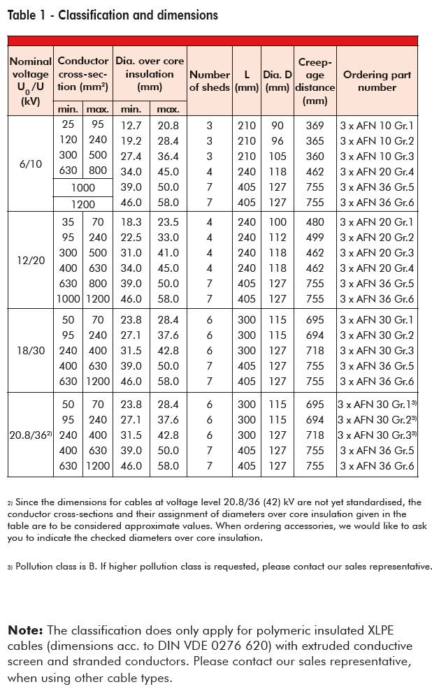 Table 1 - Classification and dimensions AFN