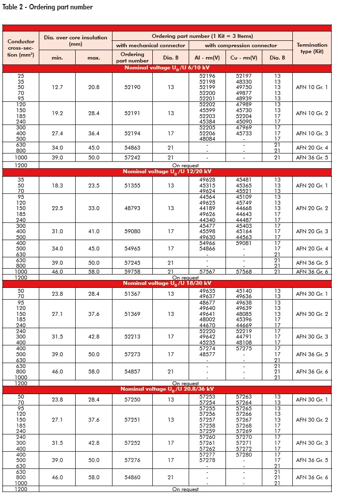 AFN 10, AFN 20, AFN 30 and AFN 36 slip-on terminations are suitable for outdoor installation on polymeric insulated medium voltage cables with extruded easy strip conductive screen or bonded extruded conductive screen.