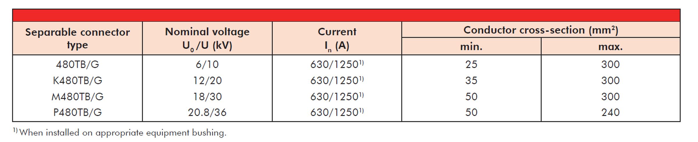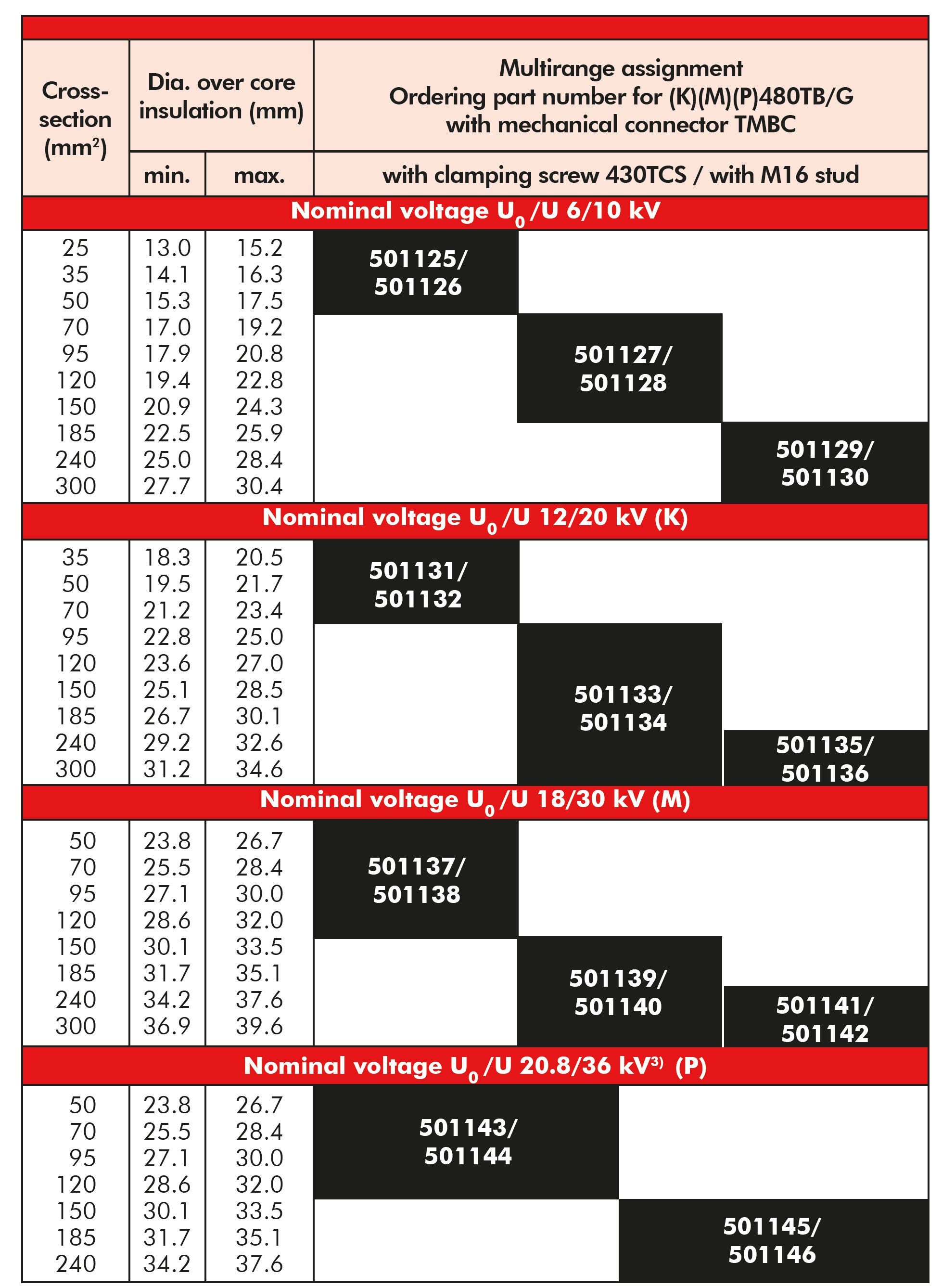 3) Since the dimensions for cables at voltage level 20.8/36 (42) kV are not yet standardised, the conductor cross-sections and their assignment of diameters over core insulation given in the table are to be considered approximate values. When ordering accessories, we would like to ask you to indicate the checked diameters over core insulation.