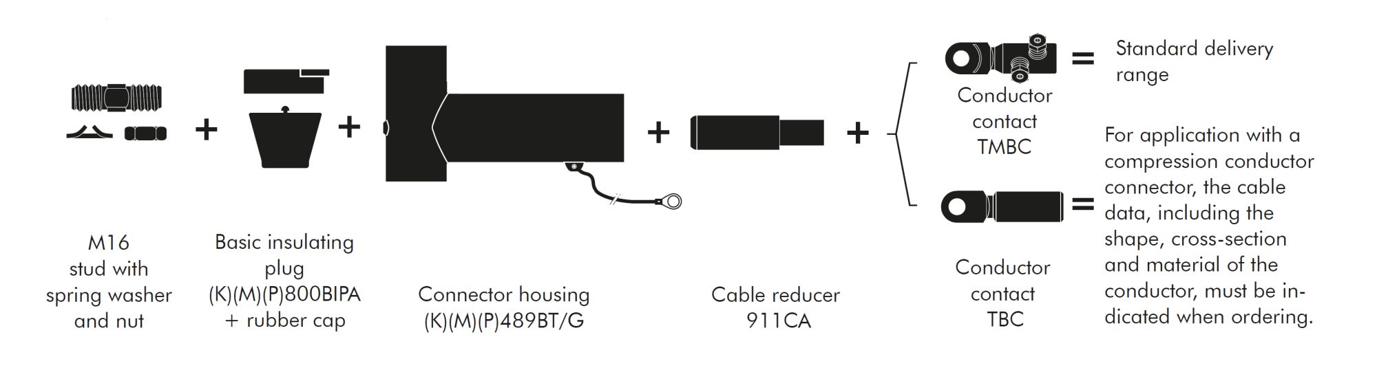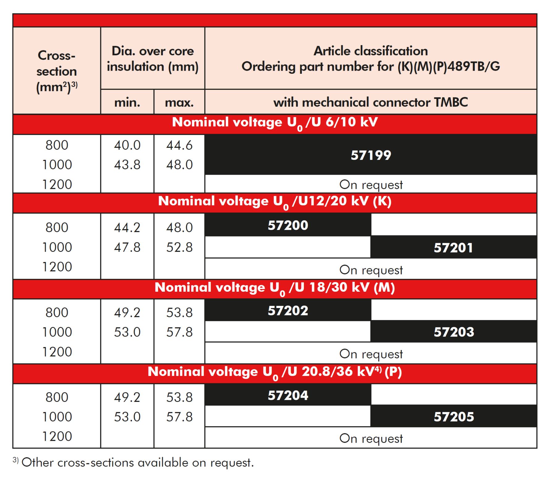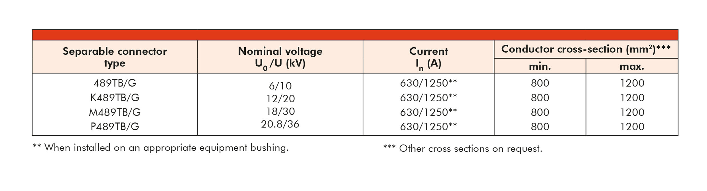 1 compact tee connector kit for 12/20 kV, for 800 mm² with mechanical conductor connector. Order according to the table: K489TB/G with part number 57200.